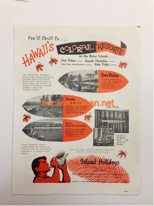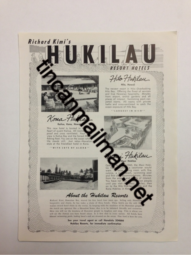 | AD62607 1957 11 1/4" x 8 1/2" Hukilau Resorts $25 |